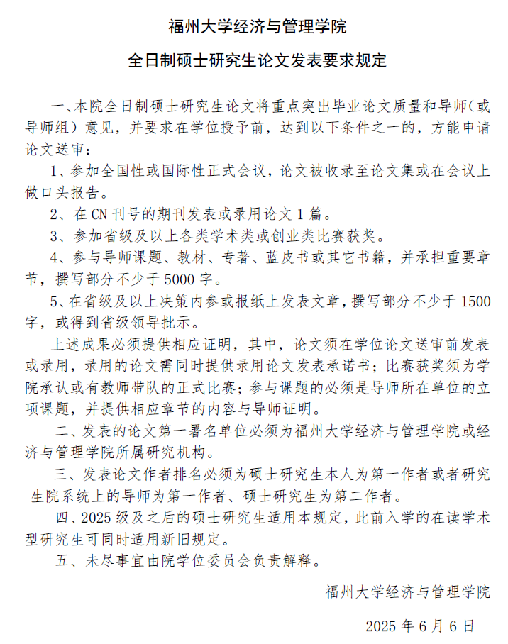 福州大学经济与管理学院全日制硕士研究生论文发表要求规定