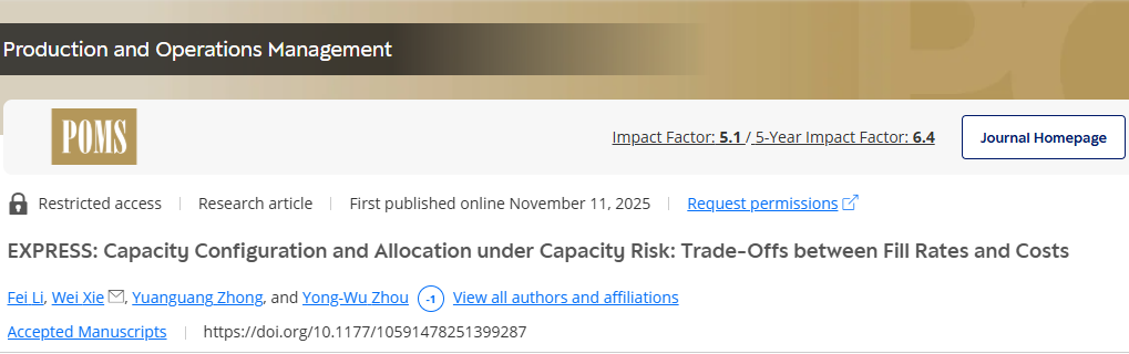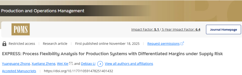 近日,我院谢维教授作为通讯作者,与华南理工大学工商管理学院合作团队在供应链韧性与风险管理研究领域取得了新的重要进展。相关研究成果连续发表于管理科学与工程领域国际顶级期刊 Production and Operations Management(UTD 24、FT 50、FMS A、ABS 四星),且两篇论文的在线发表时间相隔仅一周,标志着我院在管理科学与工程学科方向的科研实力与学术影响力持续提升,迈上了新的发展台阶。