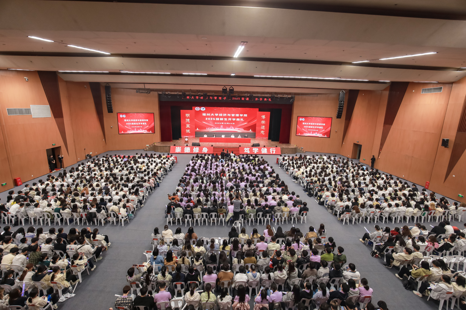 2025年10月22日晚,福州大学经济与管理学院2025级新生开学典礼于旗山校区宏晖文体综合馆隆重举行。院党委书记石炳文,党委副书记王三强、高银燕,副院长梁红艳、吴鹏,党委委员胡慧芳出席典礼;院中层干部、新生班主任、辅导员、各项表彰学生代表以及1200余名2025级全体新生到场参加。典礼由院党委副书记王三强主持。