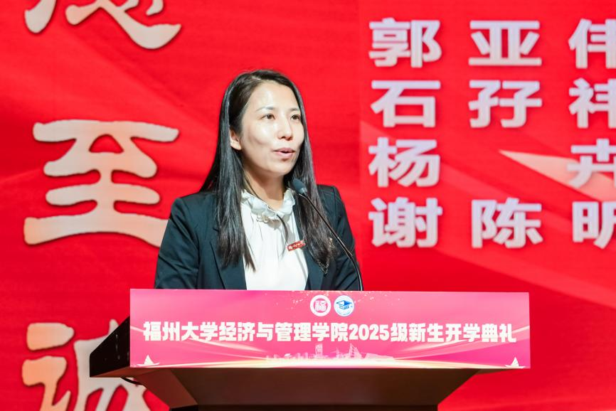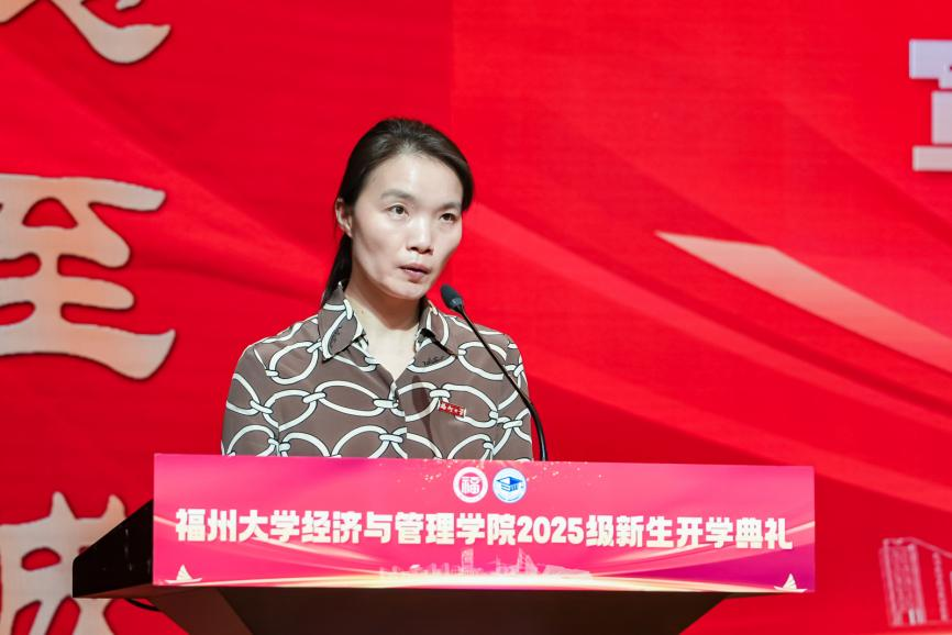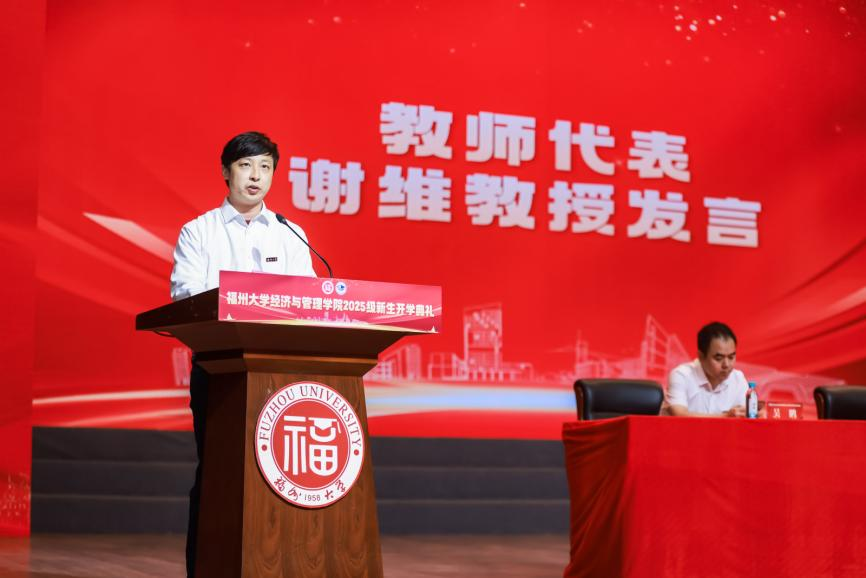 教师代表谢维教授发言。谢教授以自身学术生涯的进阶历程为引,生动分享了一路探索、突破自我的奋斗故事。他勉励同学们珍惜福州大学经管学院这一优质平台,在人生征途上始终保持探索热情,在学术道路上不断求索,找到属于自己的 “最优解”。