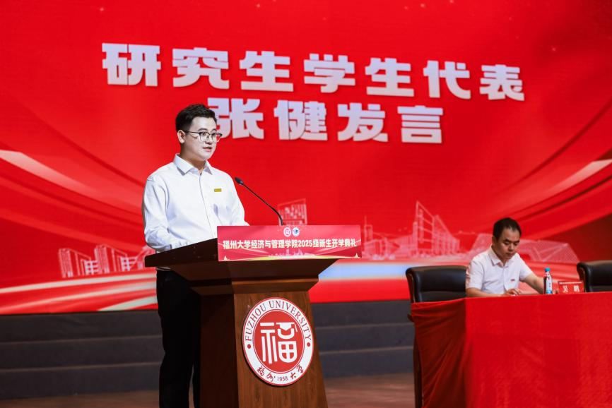 2025级研究生学生代表张健同学发言。作为一名在福大学习、生活逾六载的“老福大人”,他以“光”为喻,深情回顾了从本科求学、担任辅导员到重返课堂的成长历程。于新起点之上,他号召全体新生心怀“国之大者”,赓续福大精神,在民族复兴的赛道上奋力奔跑,争做新时代发光、发热的福大人。
