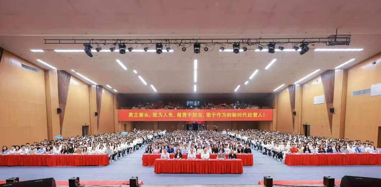 最后,院党委书记石炳文给2025级新生上了一堂别开生面的开学第一课。他首先对新生们的到来表示热烈欢迎,向支持与陪伴同学们一路成长的亲友与师长们致以诚挚的感谢与问候,介绍了学院在学科建设、科学研究等方面取得的显著成就,并以扎根自贸区、服务乡村振兴等领域的优秀校友为范例,诠释了“经彩人生”的深刻内涵。站在新征程的起点,他向全体新生提出三点期望:一是以“经世济民”立心,让梦想有“大格局”。将个人发展与国家战略相结合,在服务地方经济、贡献国家发展的实践中实现人生价值;二是以“专业深耕”立基,让梦想有“硬支撑”。不断夯实专业基础,勇闯数字经济等前沿领域,通过学术竞赛和实践锻炼提升核心竞争力;三是以“躬身实践”立行,让梦想有“实作风”。让课堂所学转化实实在在的社会实践力量,在真刀真枪的锻炼中培养解决实际问题的能力。他勉励新生传承“勇立潮头 敢为人先”的经管精神,将青春抱负融入中华民族伟大复兴的壮阔征程,为成为堪当民族复兴大任的时代新人奠定坚实基础。