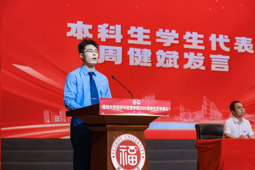 2025级本科生学生代表周健斌同学发言。曾是空军战士的他表示,他将带着“爱拼才会赢”的拼搏精神在福大这片热土上接续奋进,并激励全体新生以“崇德修身 笃学健行”院训为指引,在福大的崭新舞台上奋力拼搏,书写无愧于青春的时代答卷。