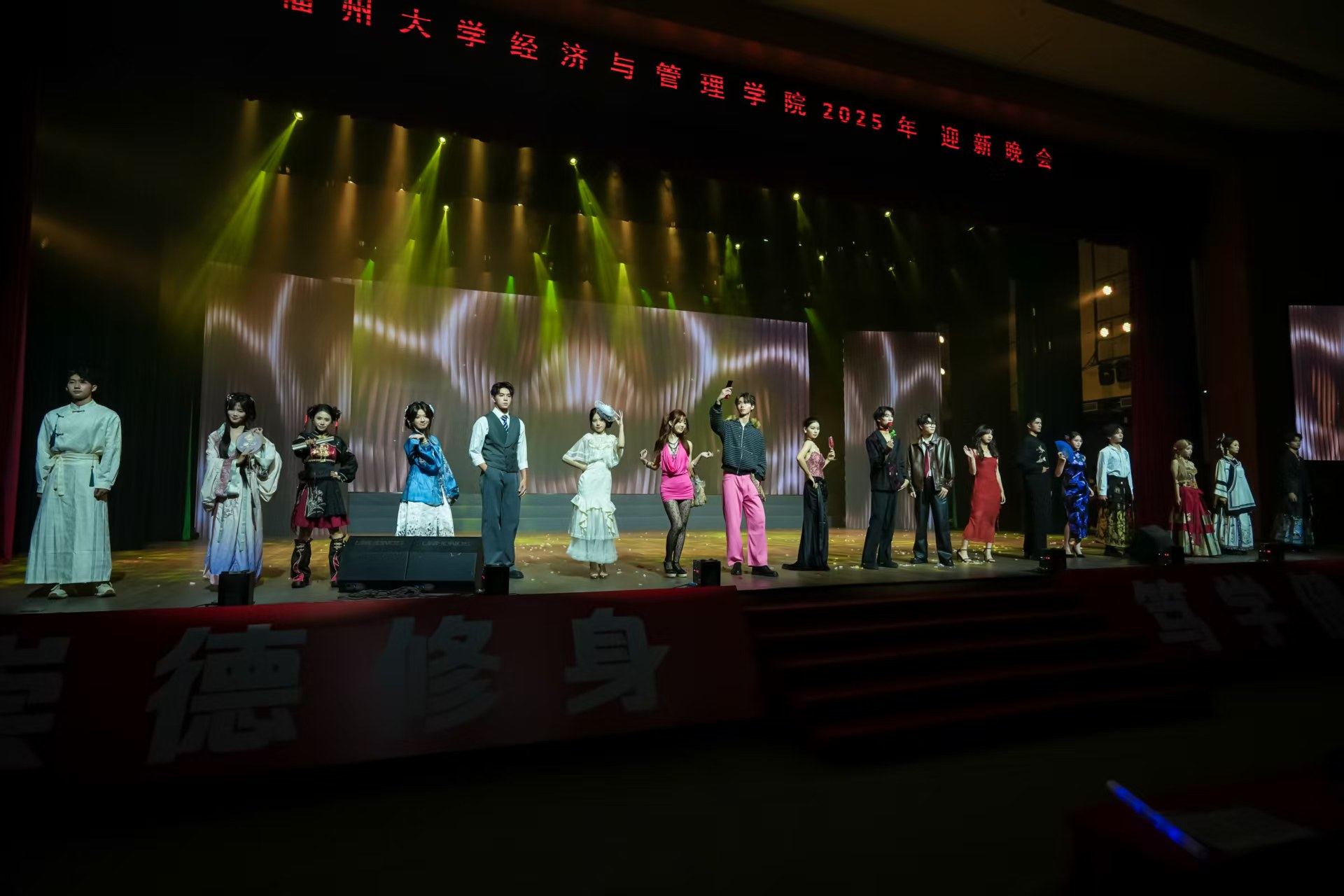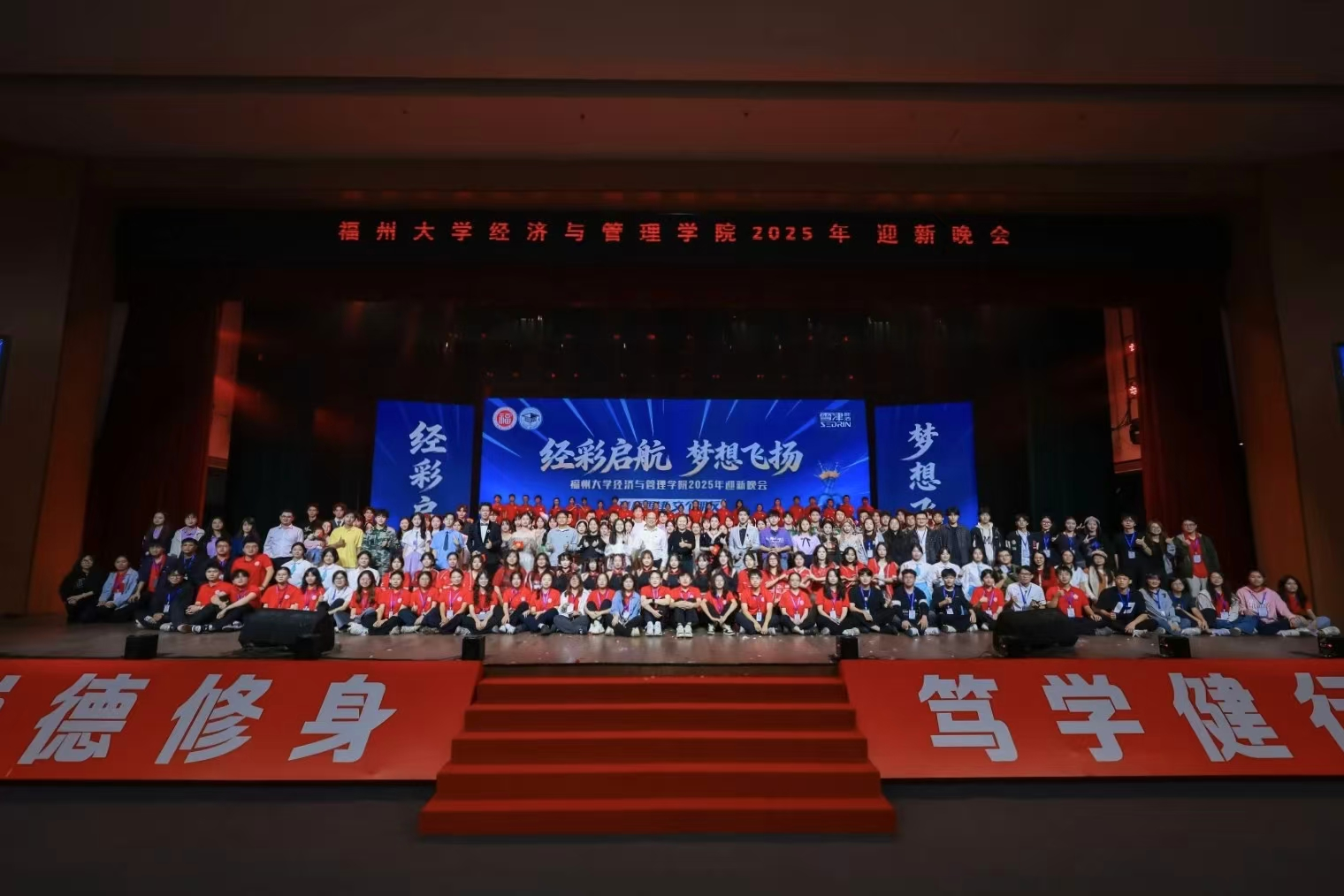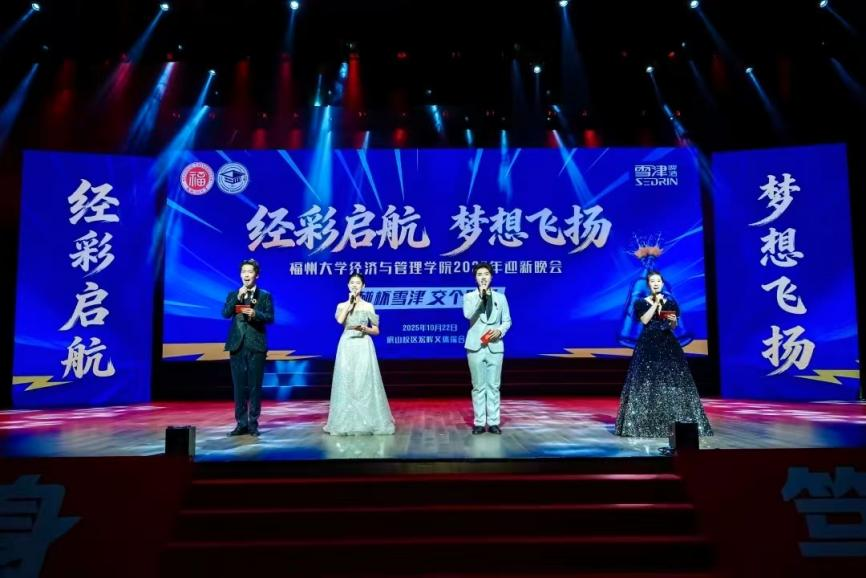 秋夜鎏金,灯火璀璨,2025年10月22日晚,福州大学经济与管理学院“经彩启航,梦想飞扬”2025年迎新晚会于旗山校区宏晖文体综合馆圆满落幕。院党委书记石炳文,党委副书记王三强、高银燕,副院长梁红艳、吴鹏,党委委员胡慧芳莅临本次晚会;院中层干部、新生班主任、辅导员、各项表彰学生代表以及2025级全体新生到场观看。
