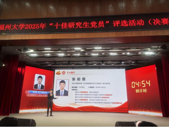 12月12日,由福州大学党委组织部主办的2025年“十佳研究生党员”评选活动在旗山校区博学厅圆满结束。经济与管理学院2024级硕士研究生张初煜凭借过硬的政治素养、扎实的学业能力与突出的理论实践成果,经层层遴选与综合考评,成功获评校2025年“十佳研究生党员”,彰显学院党建育人成效与学子卓越风采。