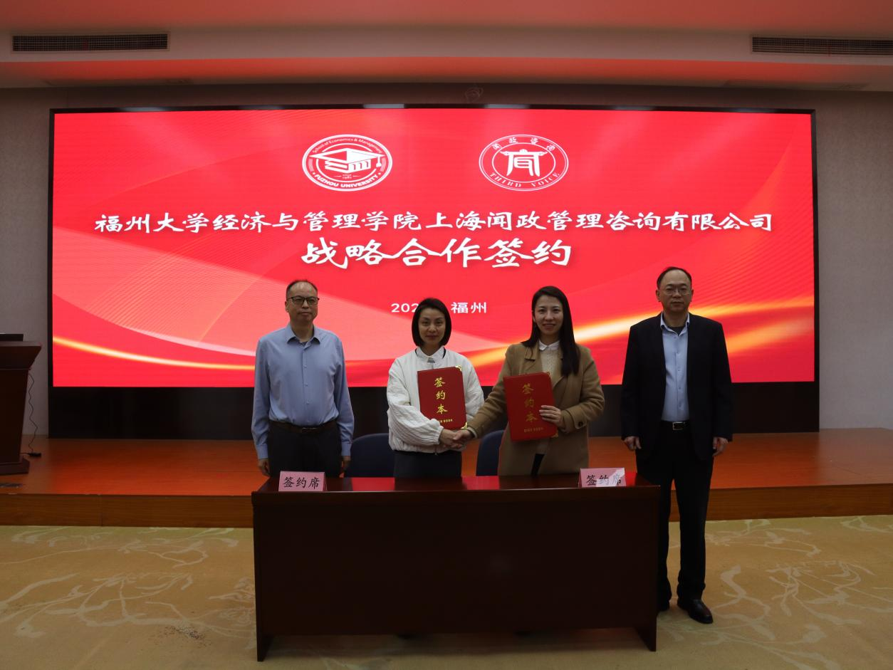 在与会嘉宾的见证下,福州大学经济与管理学院党委副书记高银燕,上海闻政管理咨询有限公司总裁王萌,代表双方正式签署了战略合作协议。签约仪式后,福州大学经济与管理学院党委书记石炳文,上海闻政管理咨询有限公司董事长刘国永一同为“福州大学经济与管理学院闻政绩效研究院”揭牌。
