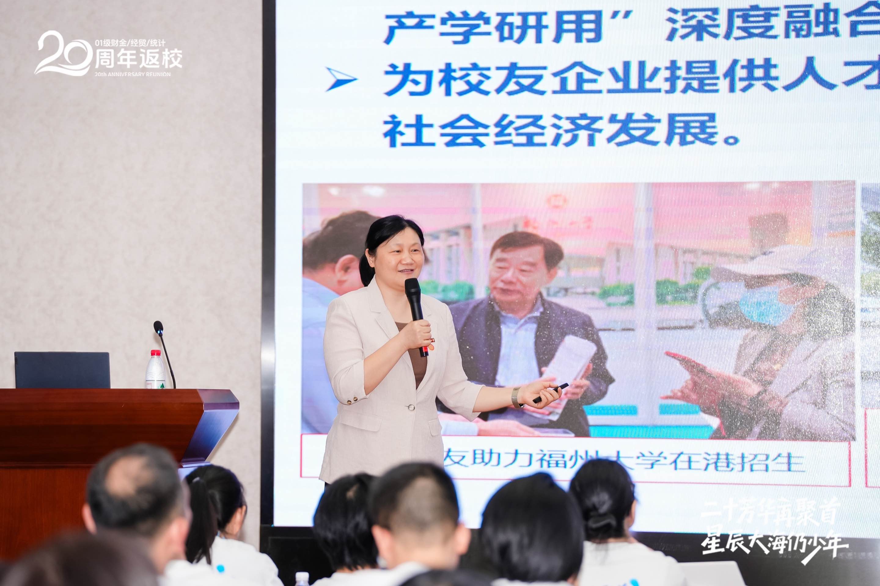 福州大学校友及基金会工作办公室主任叶青在讲话中详细介绍了校友会的服务网络和基金会的发展概况。她表示,校友办不仅是连接母校与校友的桥梁,更是校友事业发展的重要支撑,秉承着凝聚校友力量,助力学校发展的宗旨,在校园建设、学生培养、教师发展等方面发挥着重要作用。同时,她也对校友们积极参与母校建设表示诚挚感谢。