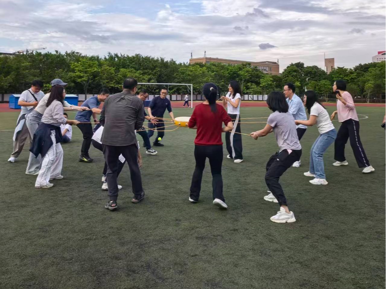 健步走结束后,趣味运动会的赛场上欢声笑语不断。投壶、同心击鼓、提绳踏板、龙行天下等项目轮番上演,既比拼技巧,又考验默契。学院的教职工们在比赛中互相鼓励、默契配合:投壶时稳准沉着,击鼓时步调一致、节奏明快,提绳踏板时呼喊整齐、配合默契,龙行天下时更是步步协同、势如破竹。赛场上的加油声此起彼伏,欢笑与掌声交织成一幅动人的团队画卷。