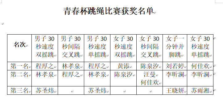 比赛现场,气氛热烈非凡。参赛选手们个个精神饱满,身姿矫健,跃跃欲试。随着裁判员清脆的一声令下,选手们迅速进入状态,只见绳影翻飞,他们的动作干净利落,节奏感十足。在男子 30 秒速度单摇跳项目中,冠军程厚之展现出惊人的爆发力和稳定的节奏。在短短 30 秒内,他以极高的频率跃动,绳体在他身边划出一道道完美的弧线,赢得现场同学的阵阵掌声。同样表现优异的林孝泉和苏圣炜,分别获得该项目的二、三名,他们扎实的跳绳功底在比赛中展露无遗。