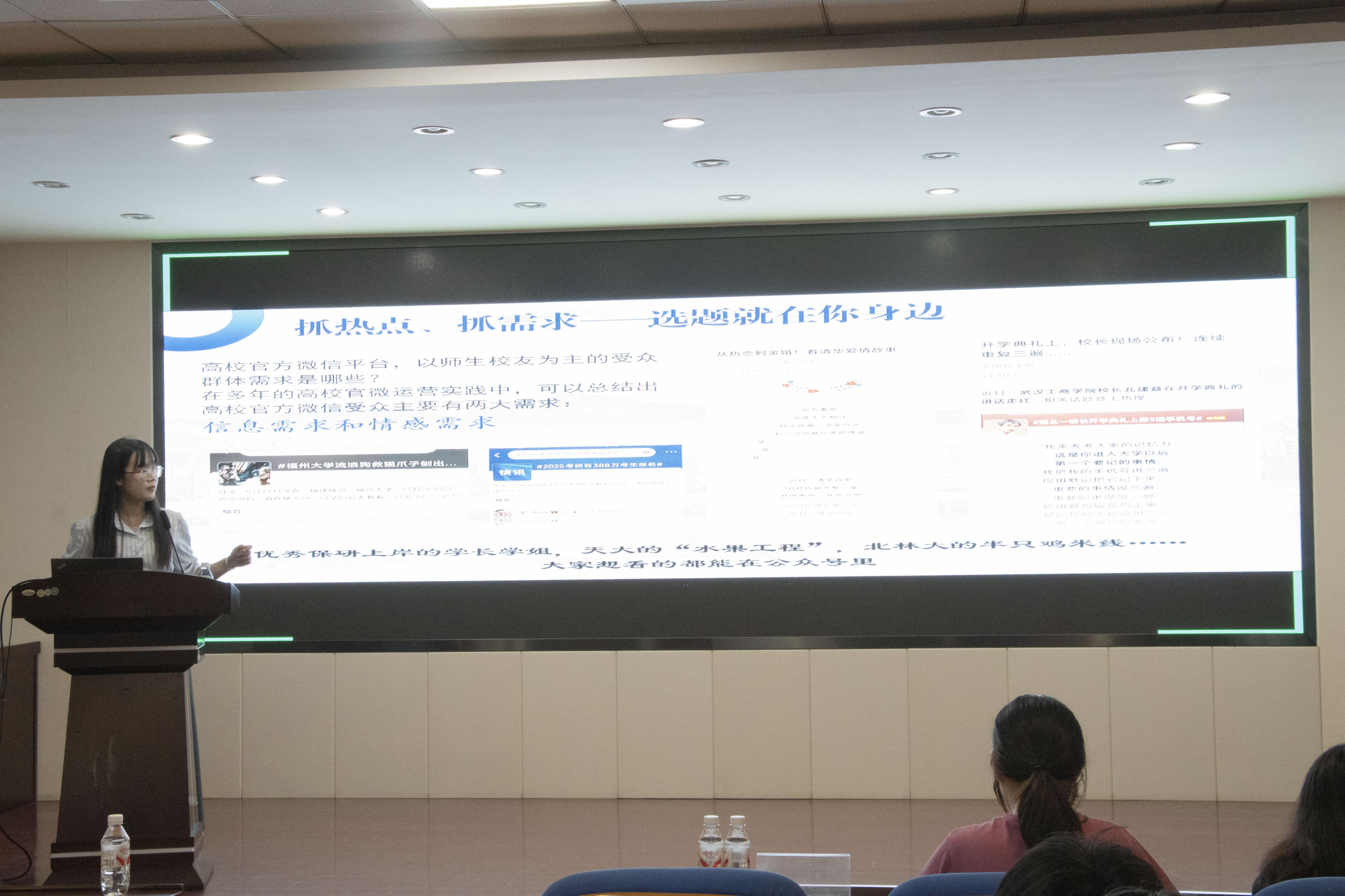 为进一步推进学院新闻宣传工作提质增效,切实提升学生骨干宣传队伍的业务水平与创新思维,助力捕捉校园亮点、传递青年声音,福州大学经济与管理学院于2025年10月12日在经管北楼316开展了以“字斟句酌见文质,媒体运营启新思”为主题的宣传工作专题培训。此次培训特邀校学生就业指导与创业中心兼职辅导员张婷、院兼职辅导员何毓晨两位老师主讲,经管学院团委书记牛秋月出席。活动通过“线上线下”双线联动模式开展,研究生会宣传负责人、本科团委各中心与学生会各部门宣传负责人以及本研各年段宣传负责人参与本次培训。
