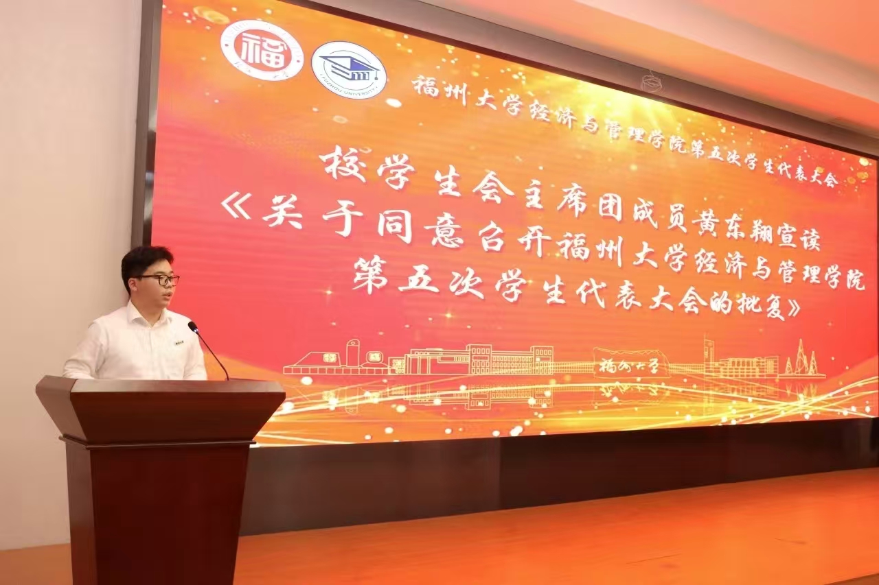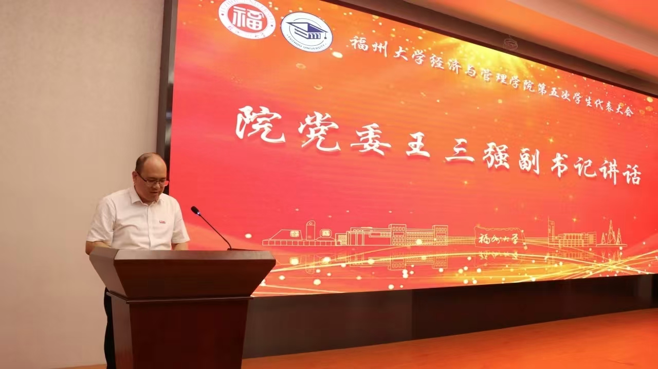 为推进“十五五”规划谋篇布局,全面深入学习贯彻党的创新理论,号召广大青年学子坚定理想信念、积极投身学校与学院建设发展,2025年10月27日晚,福州大学经济与管理学院第五次学生代表大会、研究生代表大会分别于经管西楼400、经管北楼316隆重召开。院党委副书记王三强、团委书记牛秋月、团委副书记唐丽萍、校学生会主席团代表黄东翔、校研究生会主席团代表欧雪菲及材料学院主席团代表黄心怡出席本次大会,学院专职辅导员、全体学生代表参会。