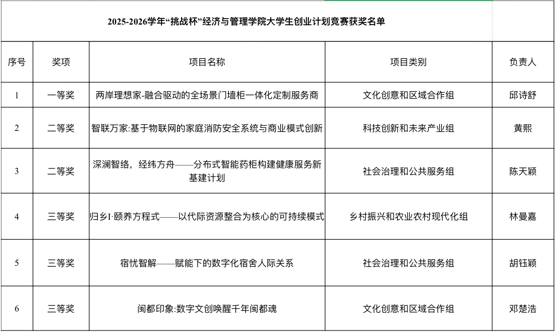 2026年3月7日,福州大学经济与管理学院2025—2026学年“挑战杯”大学生创业计划竞赛院赛顺利举行。本次竞赛由专业评审老师担任评委,围绕作品的创新性、学术价值、现实意义、完成质量等维度进行综合评审,最终评选出一批立意新颖、紧扣时代需求、兼具理论深度与实践价值的优秀项目,将代表学院晋级校级竞赛。