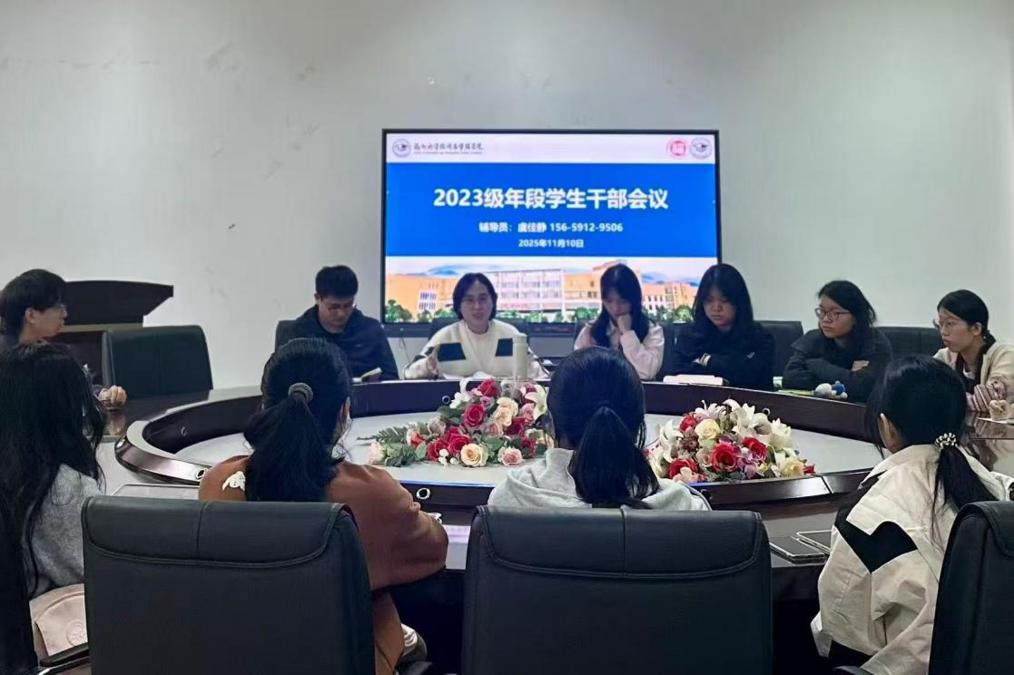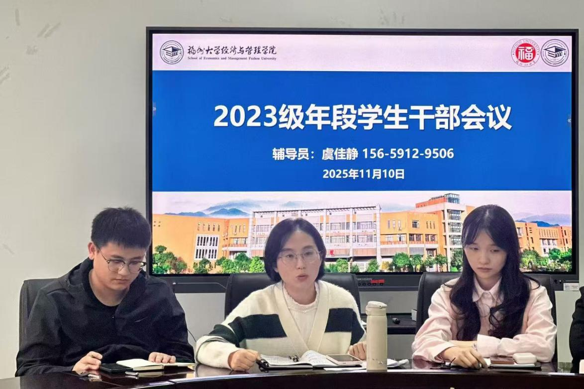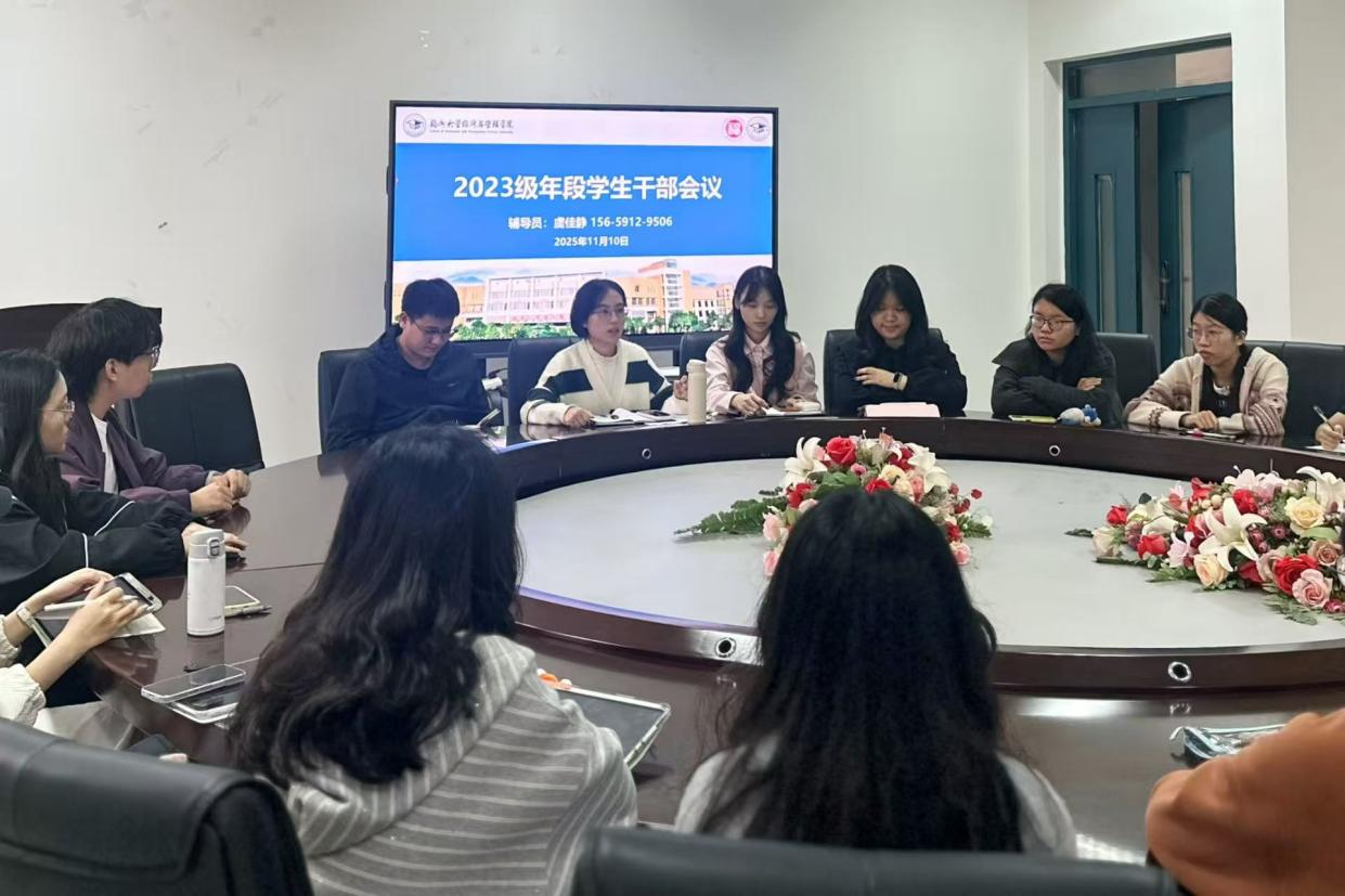 2025年11月10日,经济与管理学院2023级年段学生干部工作会议在经管北楼206召开。会议由2023级辅导员虞佳静主持,兼职辅导员张健、赖欣怡到场参会,2023级财经公物、管工工财年段全体段委参加会议。本次会议以圆桌形式开展,沟通高效深入,会议旨在强化年段学生干部队伍建设,明确阶段工作重心,凝聚服务同学的青春力量。