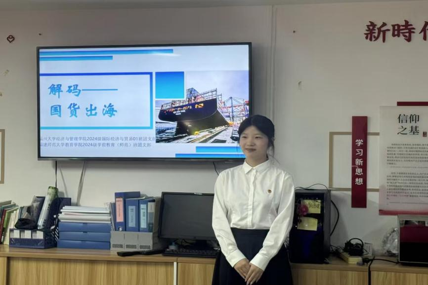 为让社区居民近距离感受国家战略与民族品牌的发展活力,2025年11月30日,福州大学经济与管理学院2024级国际经济与贸易01班团支部与福建师范大学教育学院2024级学前教育(师范)班团支部携手,走进福州本地社区,共同带来了一堂题为《解码中国品牌出海》的45分钟互动公益课,以专业力量赋能基层群众,展现当代大学生的社会担当。