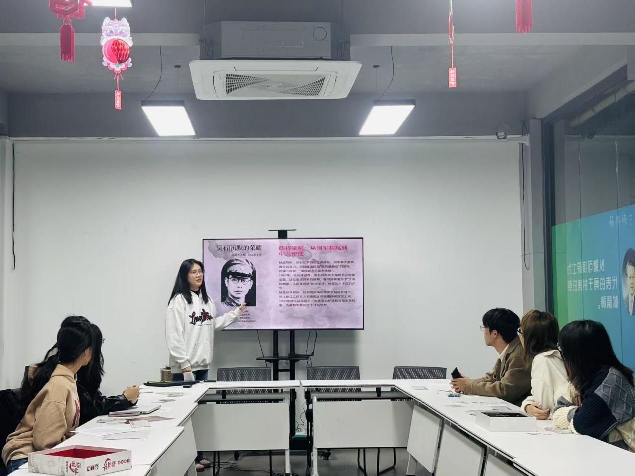 背景导赏,铺垫认知根基。活动伊始,团支书杨梓煊同学详细阐释了本次团日活动的主题内涵,介绍了《沉默的荣耀》的历史背景、人物原型与精神价值,强调了在新时代重温红色故事、传承革命精神的重要意义,并清晰梳理了“背景导赏—沉浸观影—心得悟谈—行动倡议”的活动流程,引导同学们带着思考投入本次学习。随后,通过图文结合的方式,补充了影片相关的历史资料,帮助大家在观影前建立完整的认知框架,为深度感悟革命精神做好铺垫。