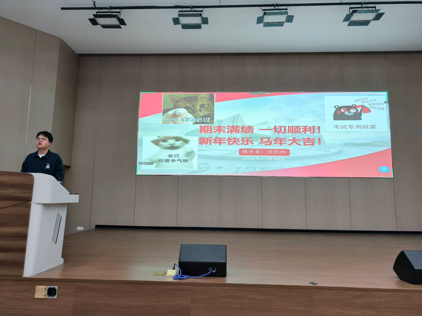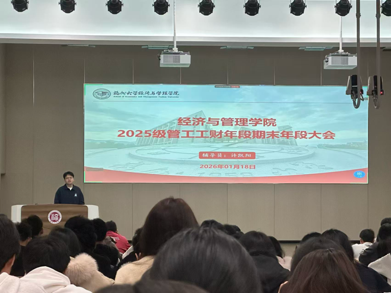 为帮助学生梳理学期学业、明确期末备考要求、规范选课流程并做好假期安排,2026年1月18日,福州大学经济与管理学院2025级管工工财年段期末大会于铜盘校区科报厅B顺利召开,辅导员许凯阳主持会议,全体学生参会。