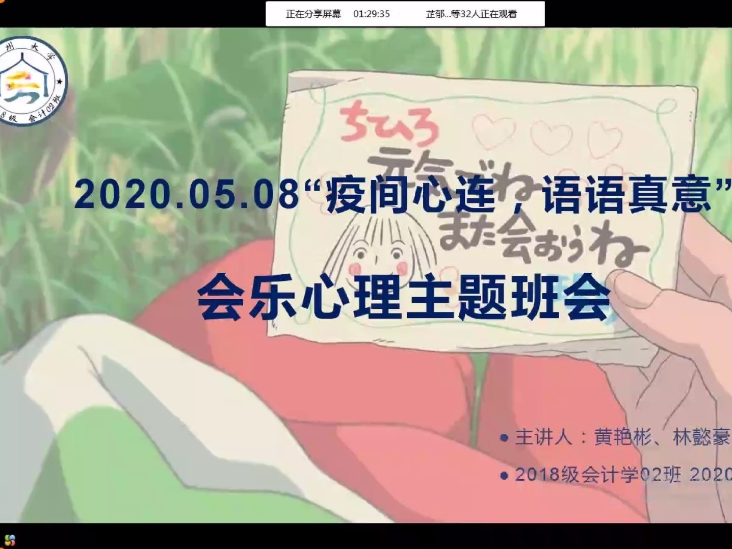 会计学02班团支部自建班以来素有举办会乐心理团聚会的传统,为呼应活动的号召,2020年5月8日15:50分会计学02班团支部全体成员开展了一场有关5·25 “疫间心连,语语真意” 的生动有趣的会乐心理主题班会,通过新鲜的活动吸引班级同学的参与。活动的具体规则是通过班级心理保健员收集班级同学对彼此的评价和认识,并由心理保健员汇总制成PPT,随后在心理保健员黄艳彬、林懿豪的主持下开展QQ群视频会议,根据屏幕上显示出的各个特点踊跃猜测所显示特点是属于哪个同学的基本特征,颇有趣味性。