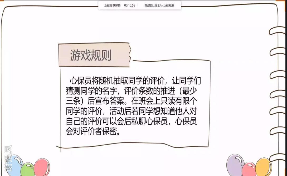 不知不觉,同学们居家上网课已十三周,时达3个月的线上学习使得教学内容没有落后,但是独自一人的学习氛围或多或少对同学们的心理健康产生一些负面的影响。班会上,心理保健员谢强凤同学首先向同学们介绍了每年的5月25日——全国大学生心理健康日,“5·25”的谐音即为“我爱我”,提醒大学生“珍惜生命,关爱自己”。核心内容是:关爱自我,了解自我,接纳自己,关注自己的心理健康和心灵成长,提高自身心理素质,进而爱别人,爱社会。这段时期同学们的心理问题主要以情感人际关系和自我成长等问题为主,加上疫情的缘故,同学们的交流变得更加的少。因此谢强凤同学深入浅出地讲述心理知识,引导同学们增强心理健康意识,提高自我调适能力,让同学们更好地度过这一段艰难的时期。随后介绍了“正念如何让我们变得强大”这一心理小知识,让同学们明白了只有当我们契入某个对象并与它成为一体的时候,我们才能真正地理解它,站在外面去观察某个对象是不够的。班会的最后进行了一个名为“猜猜这是谁”的小游戏。心保员提前收集每一位同学对其他三位同学的评价,并在班会现场随机抽取,让同学们猜。心保员对评价者保密,并让想知道他人对自己评价的同学私下找心保员了解,此举大大加深了同学们彼此之间的认识。