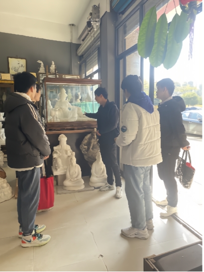 1月29日,实践队首站抵达莆田黄石工艺城,在湄洲女香事,队员们聆听工作人员讲解妈祖信俗中“请火”“割香”“送王船”等仪式里香道文化的内涵,了解到香材选取兼顾形制寓意与养神安颜的传统功效,感受香道文化融入莆阳民间生活的独特韵味。在天下寻宝店铺,队员们获知妈祖文化工艺品经营的严苛标准,立型玉、木雕妈祖像均以3.23数量尺为统一高度,对应妈祖诞辰的文化细节,更从“黑脸妈祖”的佳话与妈祖主题玉雕、木雕、石雕成为两岸交流重要礼品的介绍中,体会到两岸人民对妈祖文化的共同推崇。